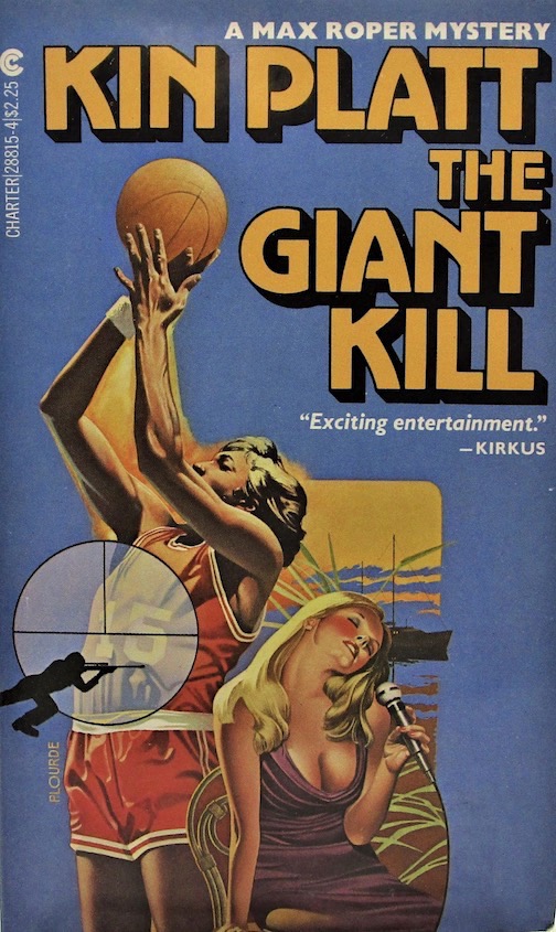 THE GIANT KILL: 'Max Roper, durable investigator, is sapped, doped and imprisoned on a boat apparently used by a mysterious Oriental for business purposes. The point of this caper is to have Max carry a warning to basketball superstar Jo-Jo Gonzaga that he must throw the championship play-off. When Gonzaga is shot and killed in his own fabulous and eccentrically designed home after his team wins the second game of the series, Roper decides to find the hoods who had abducted him. Max discovers that a lot of people wanted Gonzaga dead and that there is more to this murder than the gangland routine of forcing a team win at any cost.'