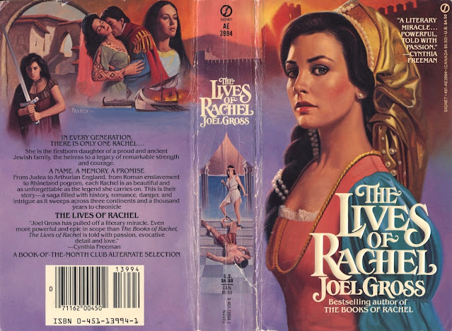 The Lives of Rachel by Joel Gross (Signet, 1985). 'In the spirit of its bestselling predecessor, The Books of Rachel, this enthralling saga plunges even further back in history to trace the heritage that links another five remarkable women... RACHEL OF JUDEA, who defied a half-mad and lustful king to save her husband's life... RACHEL OF ROME, who rose up from slavery to take just revenge against her corrupt master... RACHEL OF BYZANTIUM, a miraculous healer who risked death to help stop the spreading horror of the plague... RACHEL OF LONDON, who played a crucial part in the destiny of Arthurian England... and RACHEL OF MAINZ, who cleverly escaped a Rhineland pogrom... They shared a name and a priceless inheritance--the will to survive against all odds... '